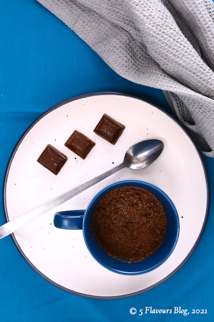- Thoroughly mix the sugar and instant chocolate mix in the bottom of a 250ml – 300ml cup or mug. Add the chocolate squares.